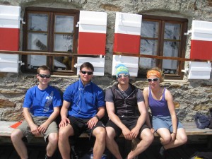 Trotz der Temperaturen mussten wir nur selten unsere Ski schultern und waren somit nach 3 Stunden (mit Pause), 8 km und 600 hm auf der Hütte. Wir schnappten uns gleich ein Plätzchen auf der Terrasse und genossen die warmen Temperaturen und die Sonne auf 2500m. Mit Kartenspielen, dem „wo – bin – ich -Spiel“ und einem (teuren) Radler sowie (einem nicht so guten) Bergsteigeressen hatten wir trotz nicht so freundlichem Hüttenpersonal, das nach einer wahrscheinlich ausgiebigen Wintersaison schon etwas ausgelaugt wirkt) einen netten Nachmittag und Abend auf der Martin-Busch-Hütte.