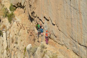 Camino del Rey: der Camino del Rey ist ein absolutes Muss, wenn man in El Chorro ist. Der Anfang des 19. Jahrhunderts gebaute Steig für den spanischen König ist ein absolutes Highlight. Seit kurzem ist der Zustieg und der gesamte Steig mit einem dünnen Drahtseil versichert, so dass man das Ganze wie einen Klettersteig gehen kann. Es kostet ein wenig Überwindung, ist aber mit dem Seil halb so schlimm. Was dann kommt, ist absolut beeindruckend. Der Steig führt durch eine Schlucht mit riesigen Wänden, Wasser und tollen Tiefblicken in einer wunderschönen Natur. Bringt man etwas Können mit, dann kann man auch hier viele schöne Routen klettern. Geht man den Steig bis zum Ende des ersten Teils, dann erwartet einen eine fast schon kitschige Badebucht mit Felswänden, Sandstrand, Blumen und ausgewaschenen Steinen. Man könnte fast denken, Hollywood hätte sich dieses Stückchen Erde für einen Film ausgedacht, es ist aber echt.