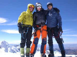 Der nächste Morgen ist mal wieder wunderschön. Ein blauer, wolkenloser Himmel begrüßt uns. Wir steigen um 8 Uhr über den Bergschrund in die Tour ein. Die Wand ist südseitig ausgerichtet was auf der Südhalbkugel Schatten bedeutet. Zudem ist die Route nur 450m lang, so dass es recht schnell geht, auch wenn wir uns knapp unter 6000m befinden. Nach 2,5 Stunden erreichen Christoph und ich als erste und alleine den Gipfel des Alpamayo, der Rest folgt. Der Blick ist fantastisch. Nach einer kurzen Fotosession seilen wir wieder über die Route ab.