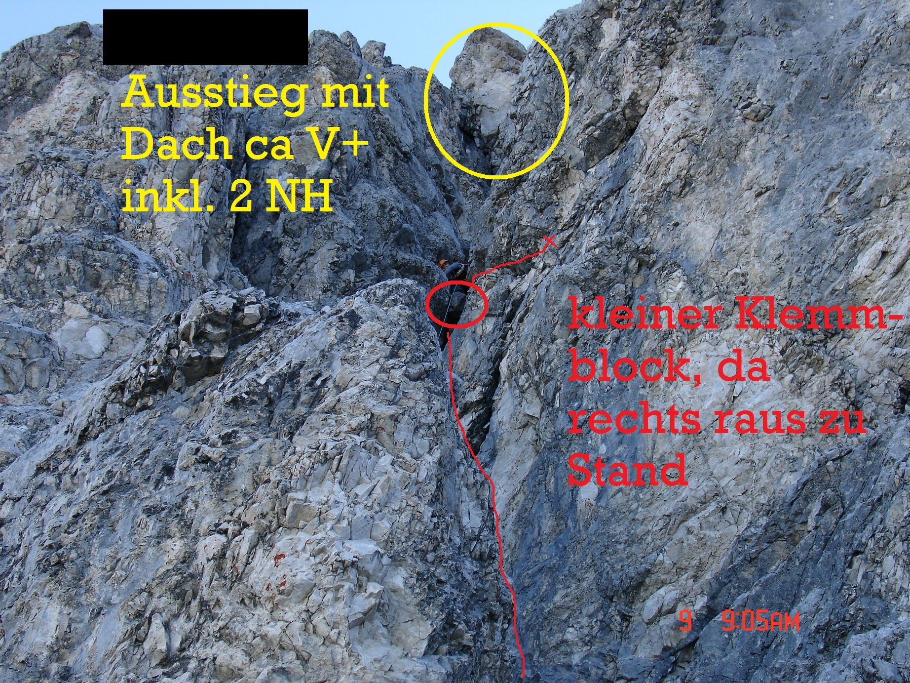 - 6.SL: Man steigt durch den Kamin auf und muss beim ersten Klemmblock nach rechts rausqueren. Da ist der Stand.