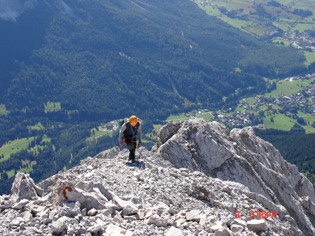 Auf dem Gipfel angekommen, sieht man das Zugspitz-Blatt und auch die Zugspitze selbst im Nordosten. Man folgt jedoch dem Grat nach Südosten (rechts) für ca 5 Minuten. Dann kommt man an einem Köpfelschlingenstand an dem jede Menge alte Schlingen zusammengeknotet sind und auch ein Normalhaken eingeschlagen ist. Auch ein alter Karabiner zum Abseilen ist vorhanden. Mit 60m Halbseilen kommt man mit einmal Abseilen bis aufs Zugspitzblatt.